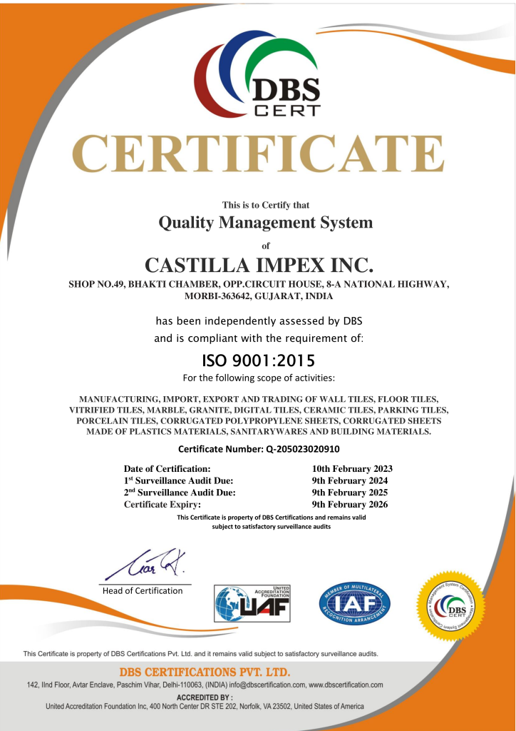 We are ISO 9001:2015 Certified Brand. Castilla Impex wherein Trust & Quality is Everything.